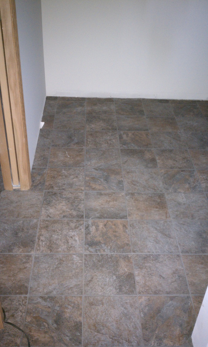 - Upstairs spare bath, downstairs bath, and garage entrance/mudroom/laundry room all have vinyl flooring installed.