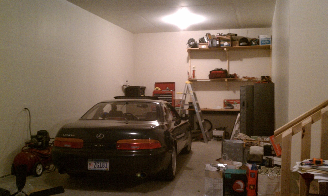 No huge updates, but some small ones. We've mainly been unpacking, and still have lots of wedding presents to go through (which you can see in the garage against the wall). But I have put up some shelving in the garage against the back wall. Going to add a couple more beams yet to make it a bit more sturdy. Also I had a bunch of old ceiling fans that I replaced at my old house still laying around because I couldn't even give them away for free. So I decided to spray paint one of them black and will be hanging it from the ceiling in the garage right above the lexus where you see a bulb. Last thing is we finally got a washer and dryer. Top load HE setup that was dirt cheap from ApplianceSmart in Champlain. Can't even see the scratch/dents