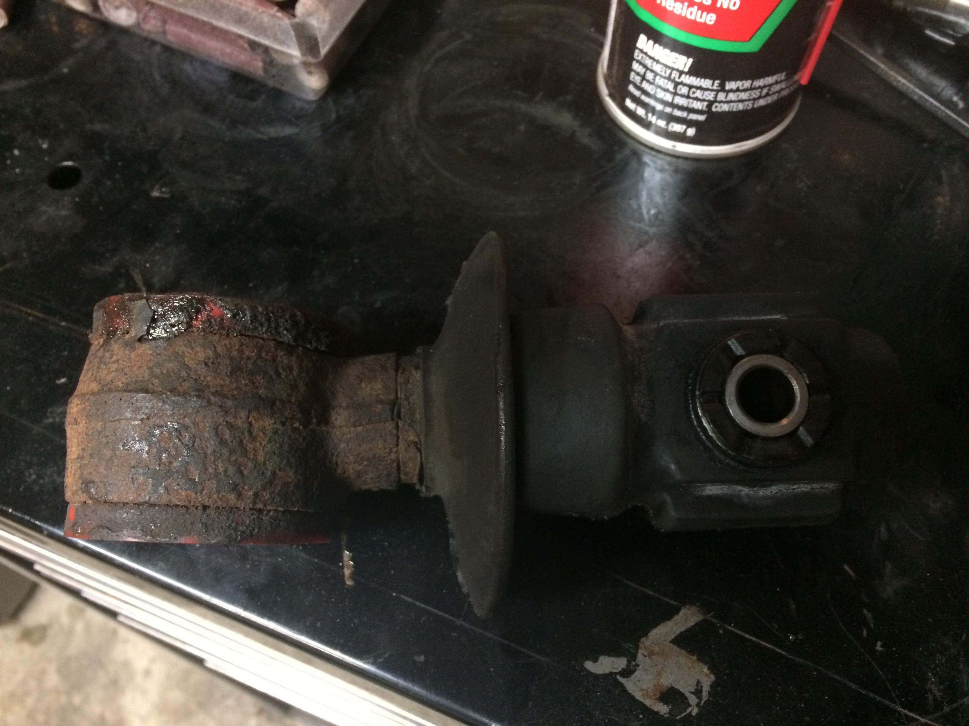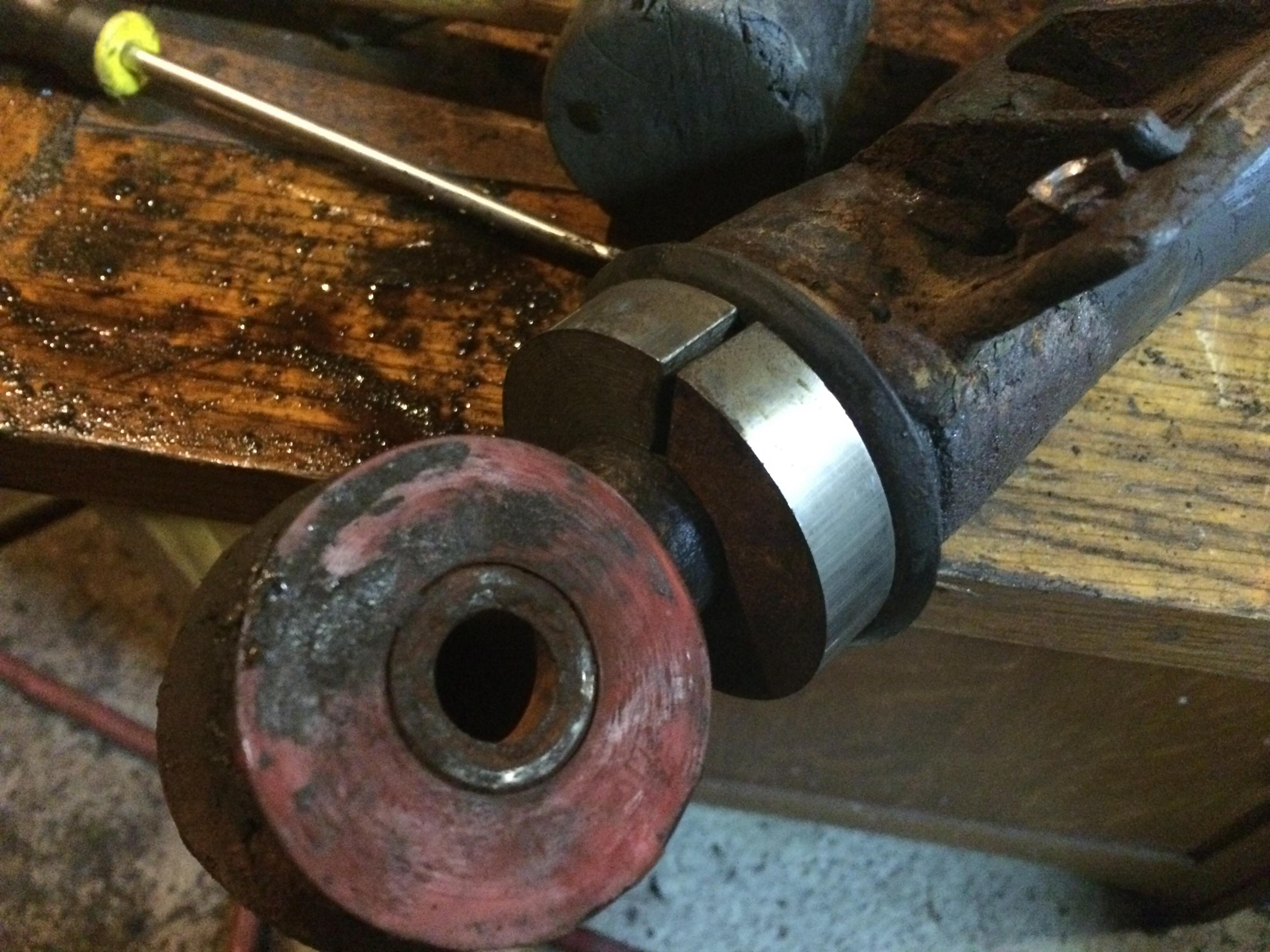 A little WD40 and two flat blade screw drivers to get it out just a bit, than a long bar through the bushing and a rubber mallet. They actually came out pretty nice compared to other pictures on the web of people burning them out. I'm glad it was in good shape as I only had to cut off the mushroom part of the rubber to put the Taboo Speed Shop solid bushings on. Now to weld them in place and paint it up.