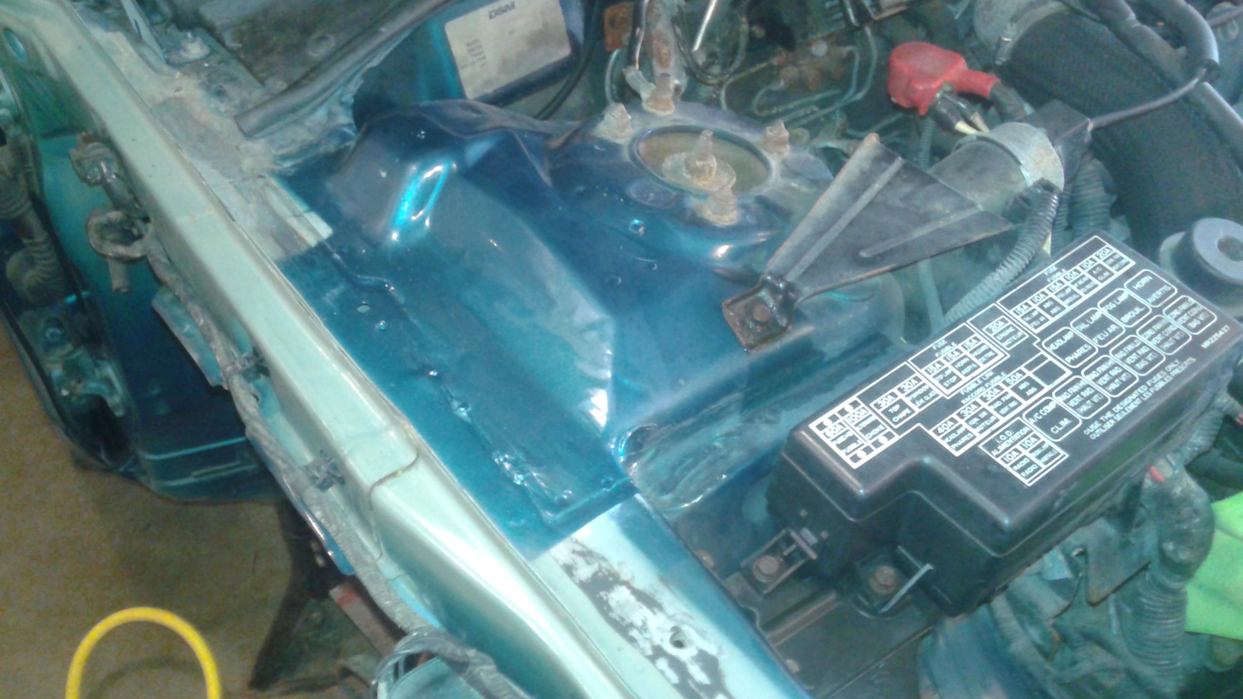 RUST!! Sometimes I hate MN. Typical 2G strut tower rust. I don't want that to spread so I cut it all out,welded in patch panels and got some PPG color match paint in a rattle can at Welle Auto. I am by no means a welder, fabricator or a body guy but I really like to do things myself if possible.