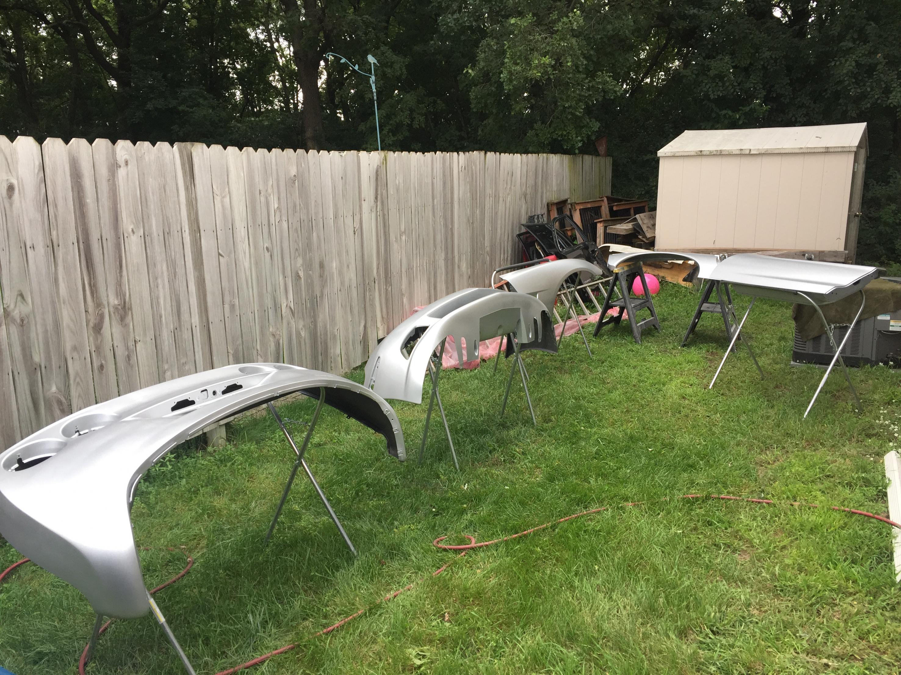 More progress today. Got all the parts painted and clear coated. Had to stop at two coats of clear because the bugs were coming out. I'll put it all together tomorrow and next week scuff it and clear the whole car for a nice even shine. Taking her up to Brainerd for boy's weekend.