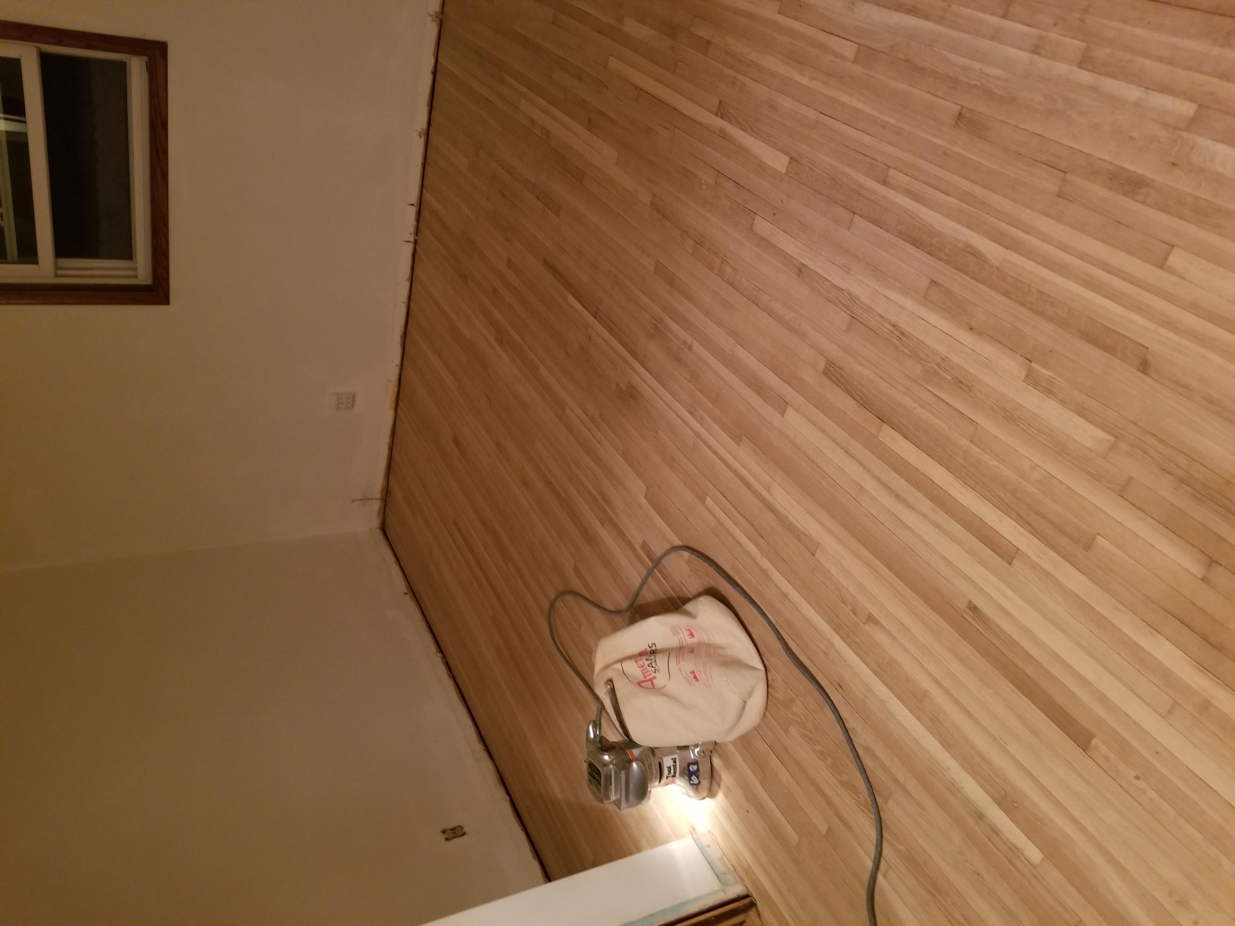 So tonight I started sanding the edges by the wall with a small palm sander thinking it was no big deal. About 30 minutes into barely cutting into the wood and the sandpaper flinging off 5 times. I went to home Depot and rented their edge sander. That made quick work of almost all of the corners. The tighter corners I'll hit with a handheld detail sander.