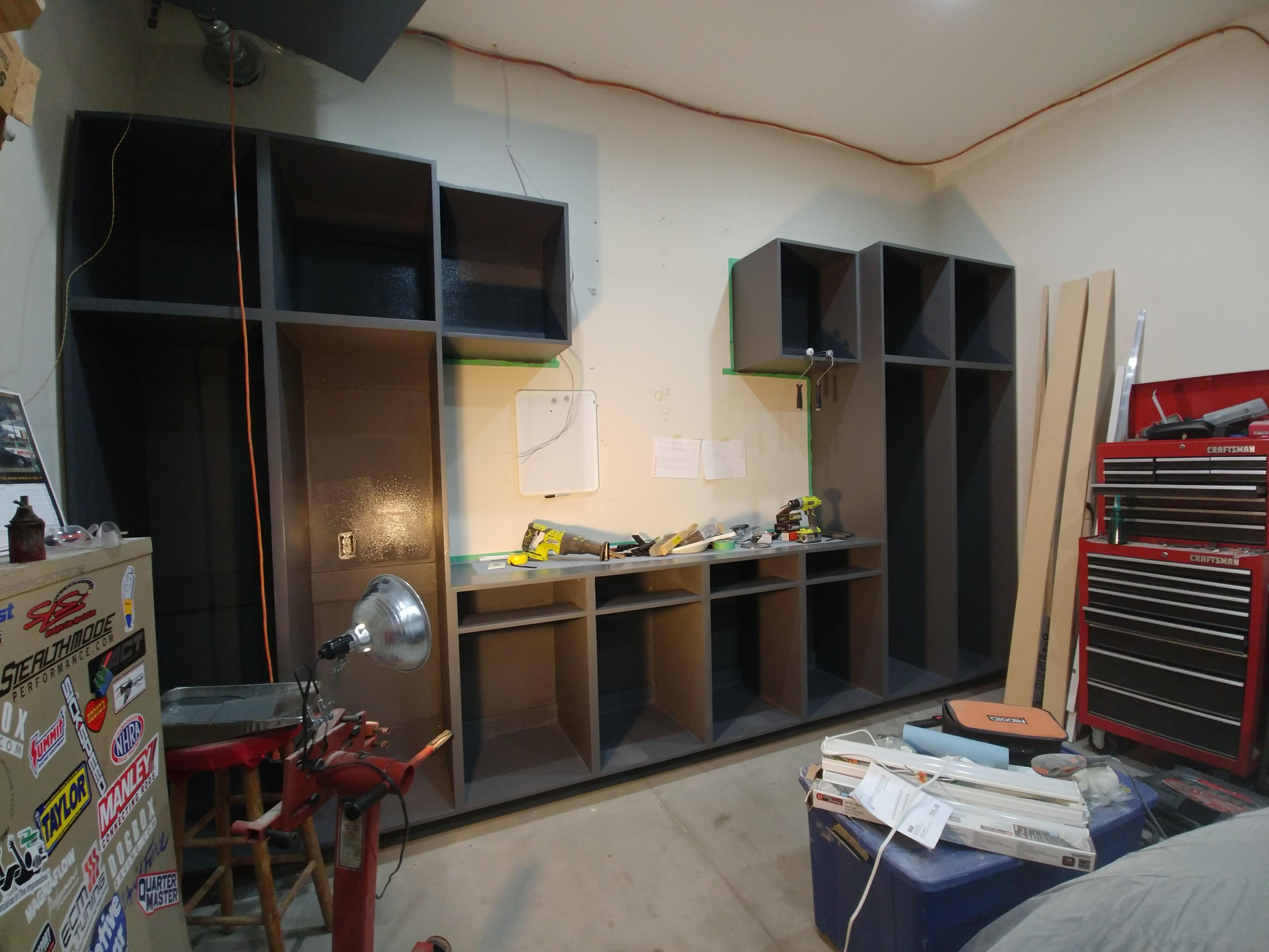 Been working on electrical lately. I have power strips mounted. I have the t5 fixtures mounted. One underneath to light up the work bench surface, and one mounted to shine towards the car for imoroved under hood lighting. Each on their own switch. Still buttoning up that wiring. Also i bought 4 in ceiling soeaker from monoprice ($35/pr). Have our downstairs receiver land sub out therr for testing out. I also bought a used 8" 150w sub off ebay (same as the one im testing out). Hopefully get these ceiling speakers mounted and wired soon. I can fit a max 43" flat screen on the shelf, so im just keeping an eye out for some kinda smokin open box deal at best buy for a 40-43" smart tv (hoping for something around $150).