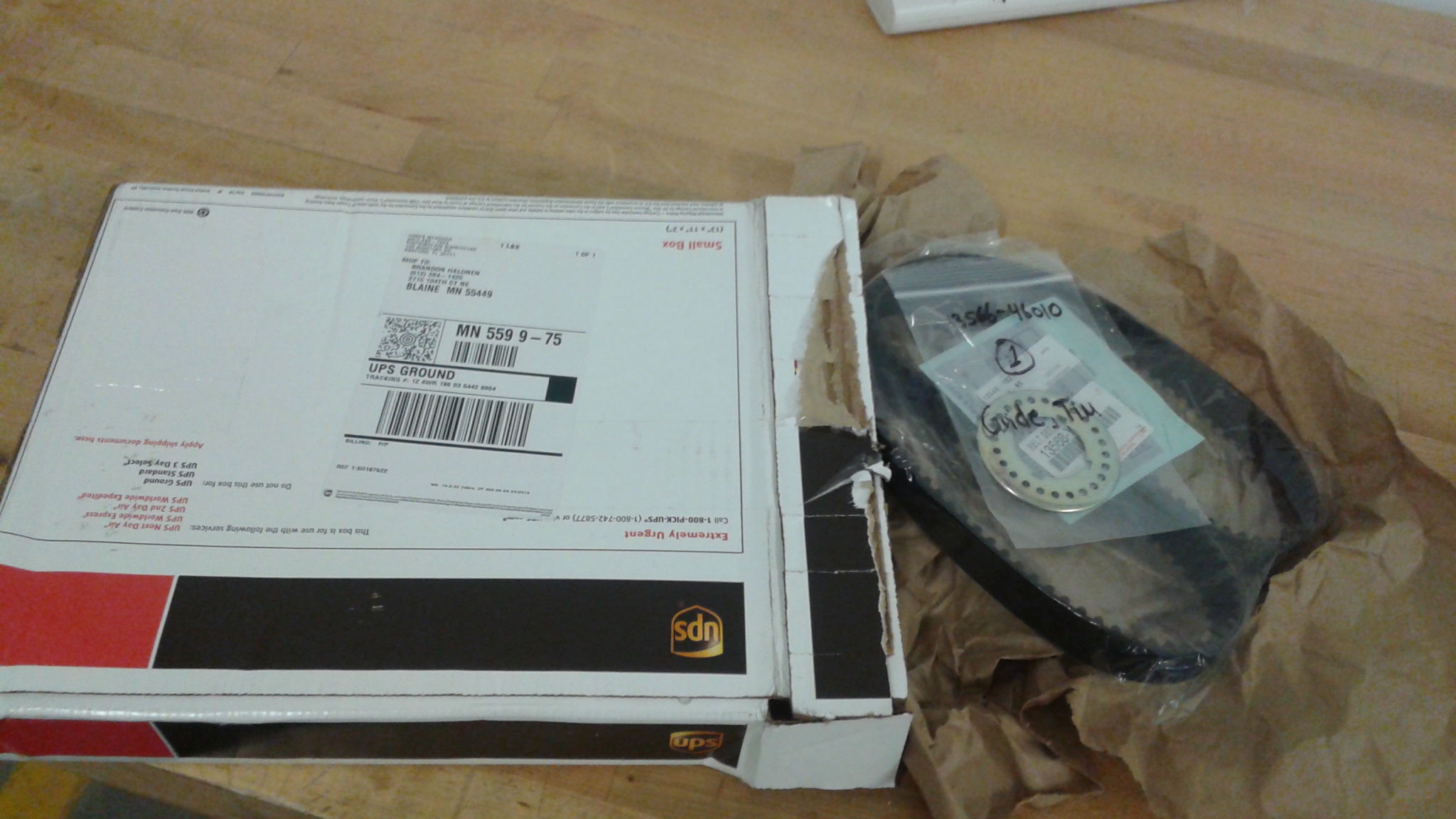 (5/4) - I had gotten a few misc items buttoned up and wanted to take the car for a spin. While wiping down the motor, I all a sudden noticed the T-Belt was half way off the cam gear, ermagrd. How does that even happen? It sawed right thru the plastic lower timing cover. I started taking it apart and realized that the little guide plate that is supposed to be on the outside of the crank sprocket was missing, which is basically like a large thin washer looking thing that keeps the belt put and doesn't allow it to walk off. So that same day I order up a replacement T-Belt and that guide piece from Real St. for $50. I think they source it from the dealer so it'd be a few days until they got it and then shipped to me.