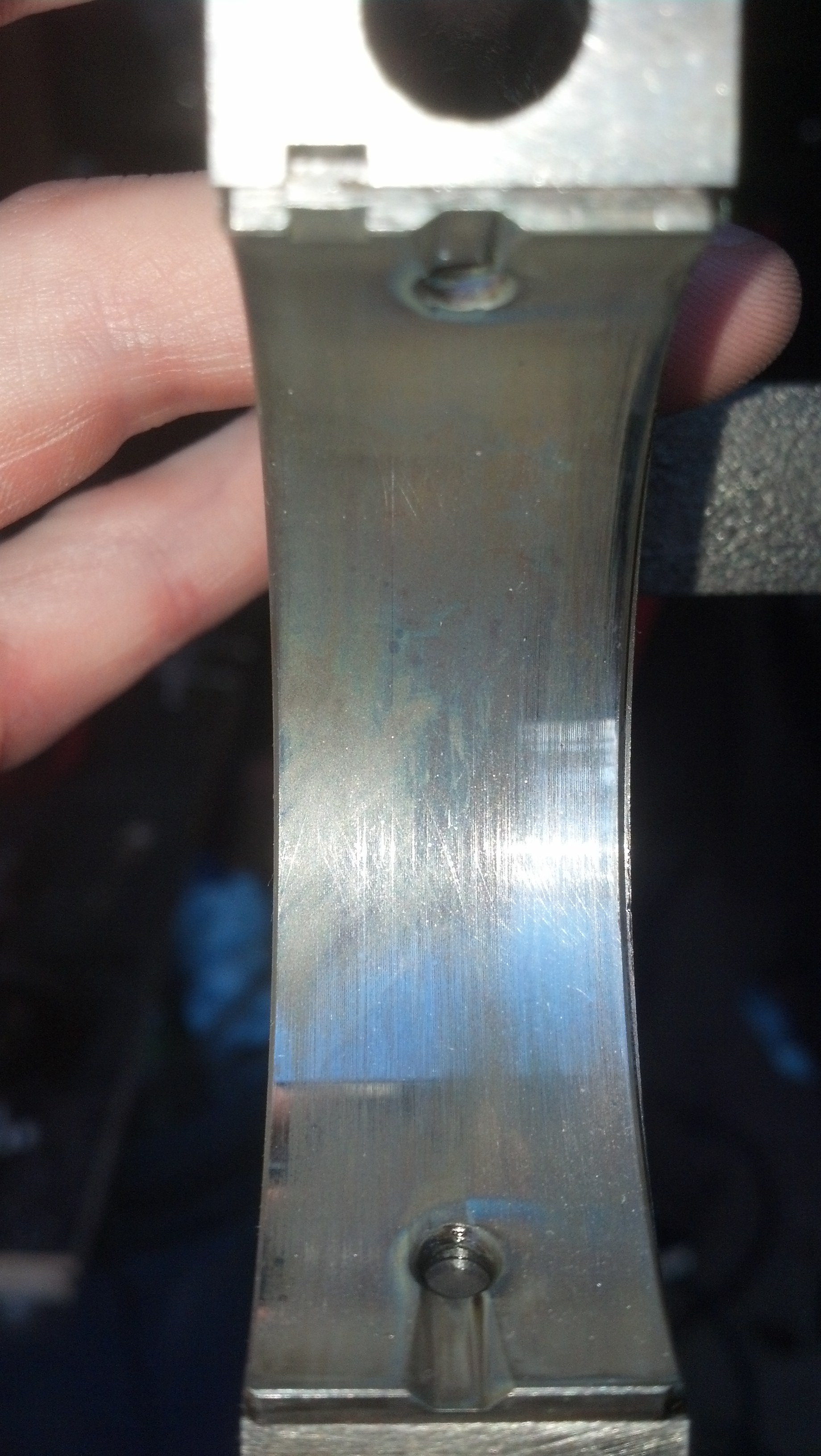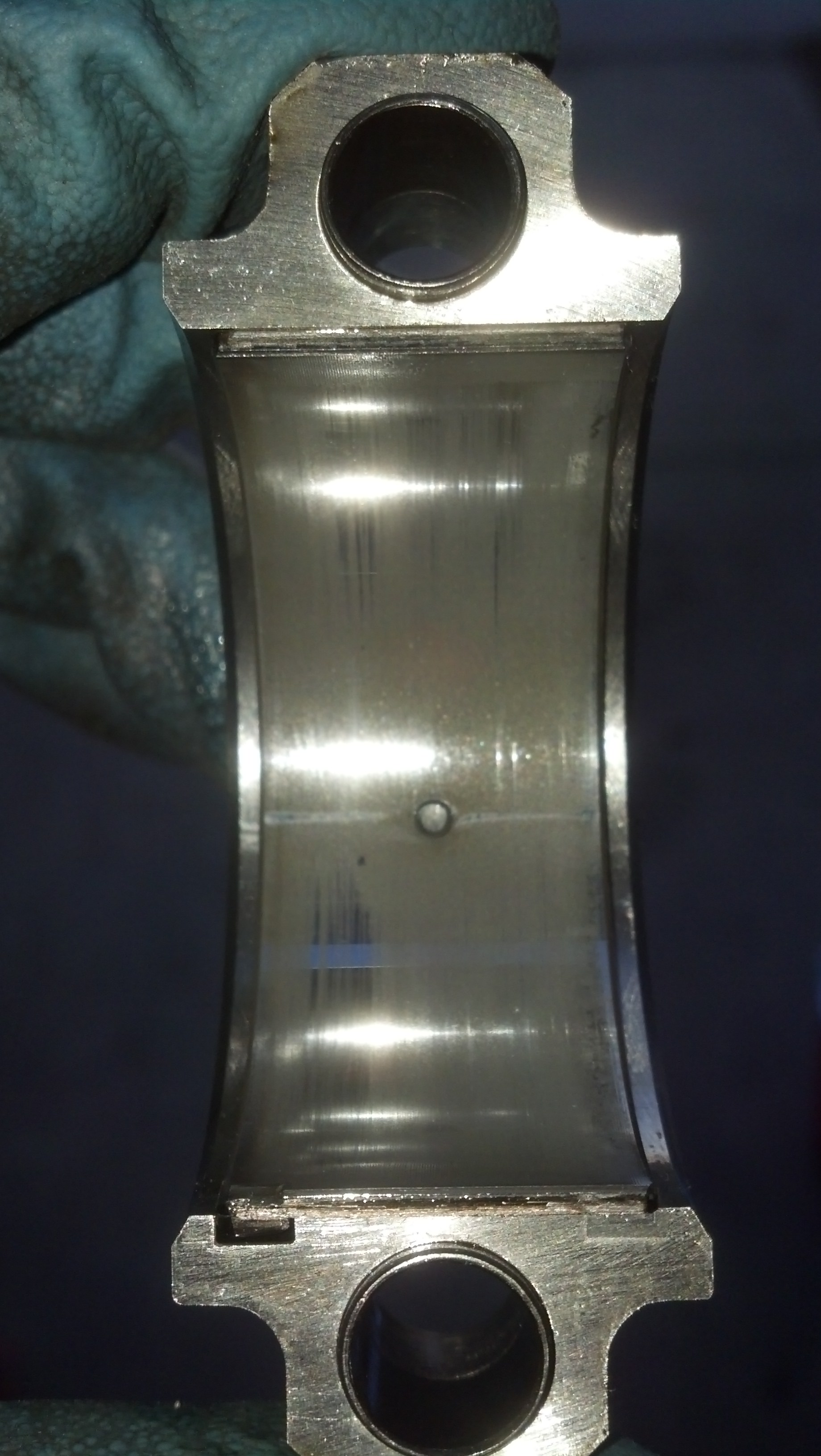So I pulled the first main cap and the #1 rod bearing cap so they could look better and they could look worse. They feel smooth when you run your fingernail across them lightly. Realistically they are probably useable. I'm not 100 percent sure what I'm going to do with them yet. Anyways on to the pics. Feel free to share your opinions on what to do with the bearings.