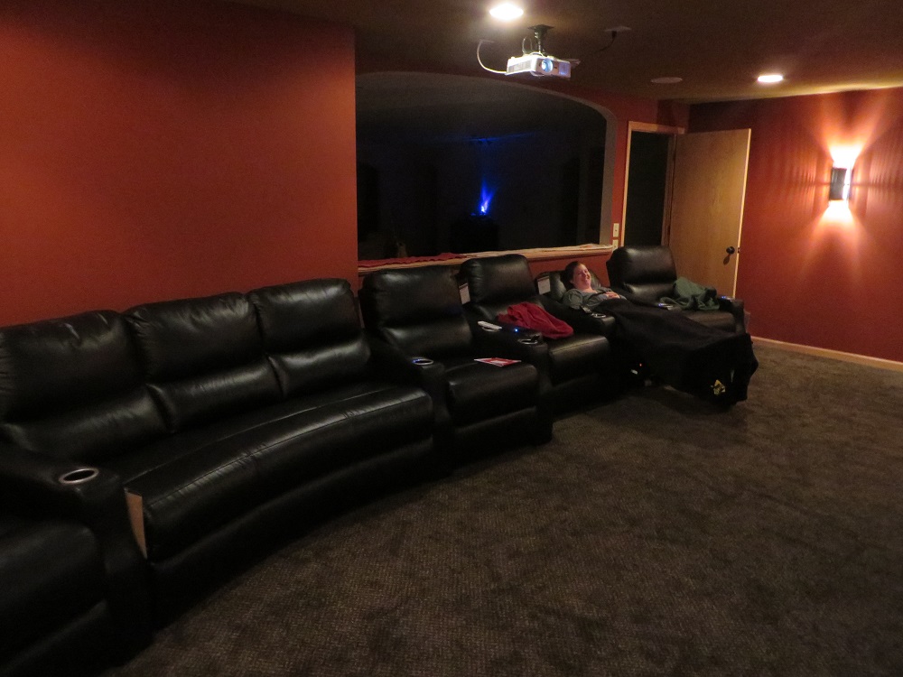 99% Done! Only thing left is to mount the frame for around the screen, put the cold air return face back on, put the sealer on trim and bar top (hence the table clothes on the bar top), and then figure out these couches. They are power reclining but acting kind of funny. What we also found out is the longer wedge piece is Bluetooth capable, the center cushion folds down and has all sorts of functions. It also has a "thumper" speaker under it that will thump with the bass of a movie. So gotta get that all figured out.