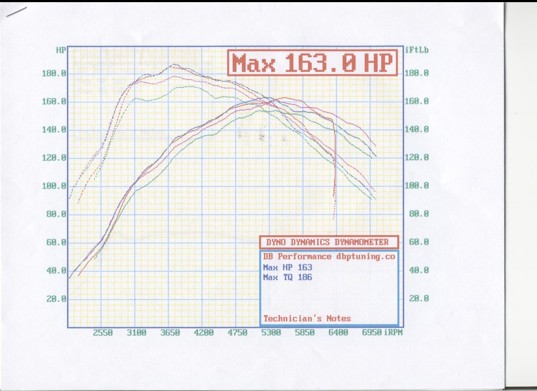 This fall at DB the only changes I made was the installation of a full 3" exhaust. I ran lower octane and lower boost 17 spike and 16psi steady and on not so great plugs. Max WHP was 163.0 and max WTQ was 186 with a slow drop after. Peak HP was ~5100RPM and drops slowly after that. AFR was on the rich side between 10 and 11.