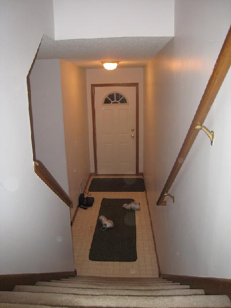 Here is what the entry way looks like right now. As you can see, it's livable, but kinda ugly. The floor is starting to peel up at some of the seams slightly. The walls are covered in dirty finger prints. The light fixtures look like butt.