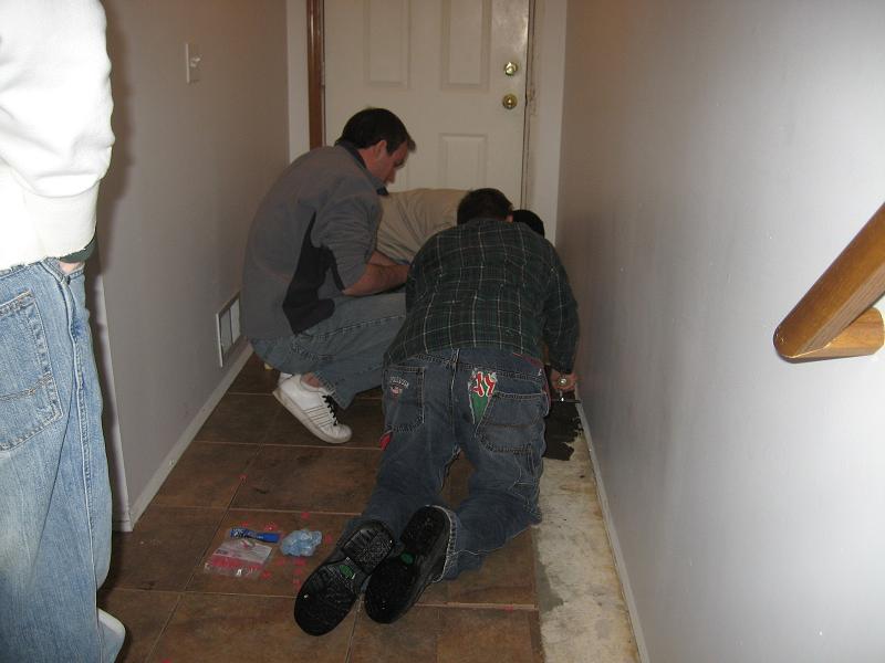 Wow, I just spent all day at the Fridley house. Thinset straight on plywood sucks ass!! In about 6 hours I got a 8'x10' area chipped up. I am not quite 1/2 done with it. This is by far the worst thing I have had to do as far as remodeling. Even worse than shoveling out the old landscaping rock and putting mulch down.