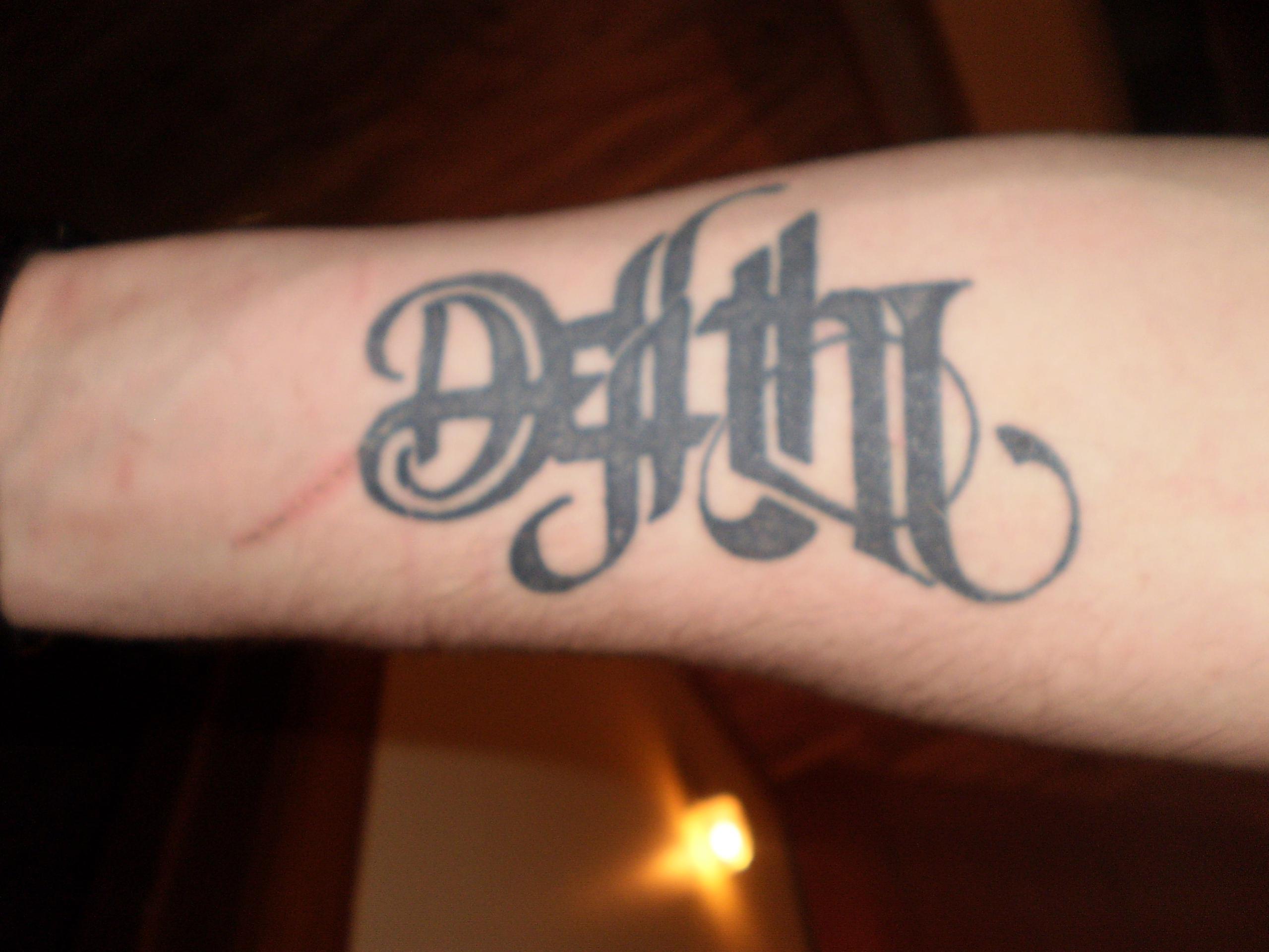 Second-It's "brothers" in japanese. One of my best friends drew it up for me, he currently has the tattoo (a lot smaller than mine), and my little brother will as well (once he's 18). (yes, it for sure says "brothers", not "pig fucker" or something like that..haha, I researched A LOT before hand).