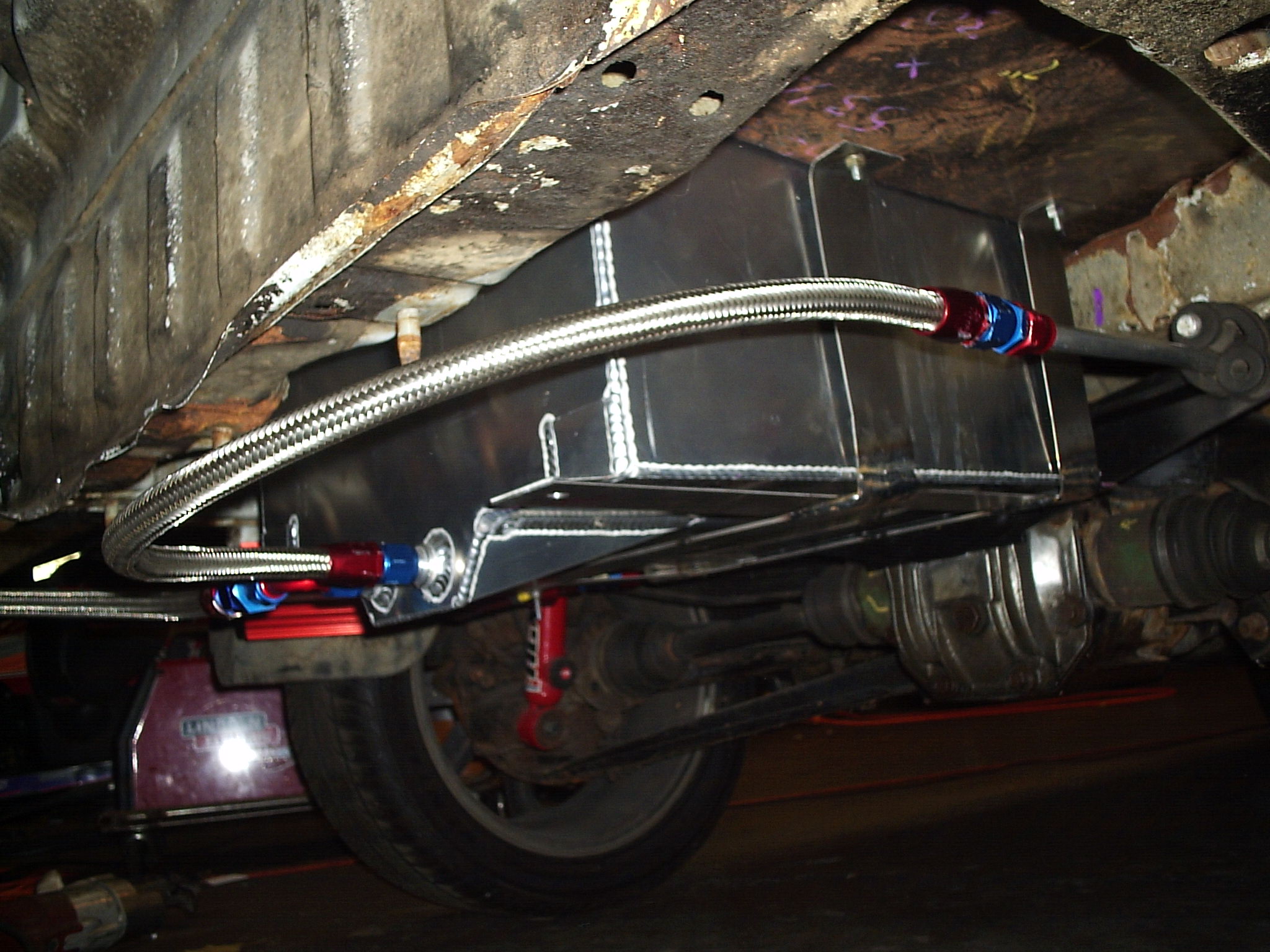 Over the weekend i managed to get all the fittings and other misc stuff to finish up the fuel setup. I had my buddy who works at a steel company shear me some 2" x 60" 16ga steel strips. After about 45 minutes i had the brace done and ready for the cell to go in, Im actually really happy on the way it turned out. At the moment though im regreting not painting it, But i think im going to pull it off and throw a couple coats on it just so it doesnt rust away.