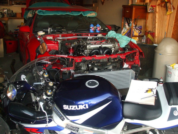 ^ first things start up. Then I will button things up and make them look better, I could have this thing on the road next week. BUT, I need to get at least 2 to 3 more things befoe tuning it. BAP,A1's, and make my exhaust. I am going to use the downpipe that I have on there and then cut the one that I had on there before and weld it to fit the downpipe.. I like everything about thermal exhaust better then the one that I was going to use.