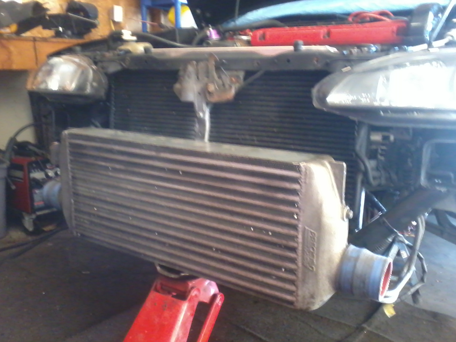 I picked up a Precision 750HP intercooler today off of Craigslist. Its a little dirty but in good shape. I welded mounts off the tubular core support. It is nice and solid and the pipeing I have will hook right up. I also got the stock radiator ducting from the parts car I picked up and modified it to work with the new FMIC.