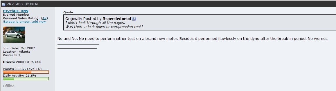 Hopefully its good. For the same price, his motor could have been built brand new including new valves/seats and guides and it would have had Mivec seeing his is a Evo 9.