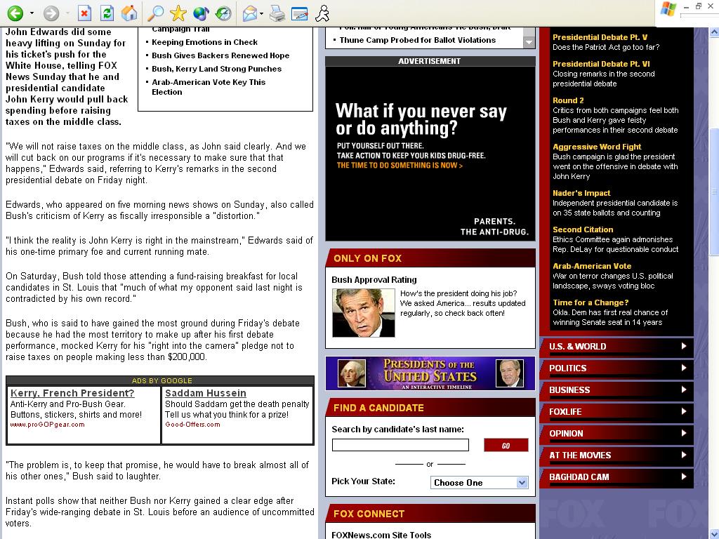 Fox is conservative. You mentioned several are talking out their asses. Ohm, that would be you. You started this post. I really believe you are questioning your beliefs, otherwise you would not be asking questions. Dont make decisions by what you see on TV. Make decisions about who you want to vote for by understanding republican view and a democratic view. Next step is to really think about the answers and open your mind. I beleive most people vote democrat through emotion. That is probably why I see people like michael moore or ridiculous people standing on bridge yelling at cars to vote for kerry. The debate to me means nothing. I am not undecided, but believe Bush won the second debate. Kerry is like a trail lawyer putting on a show.