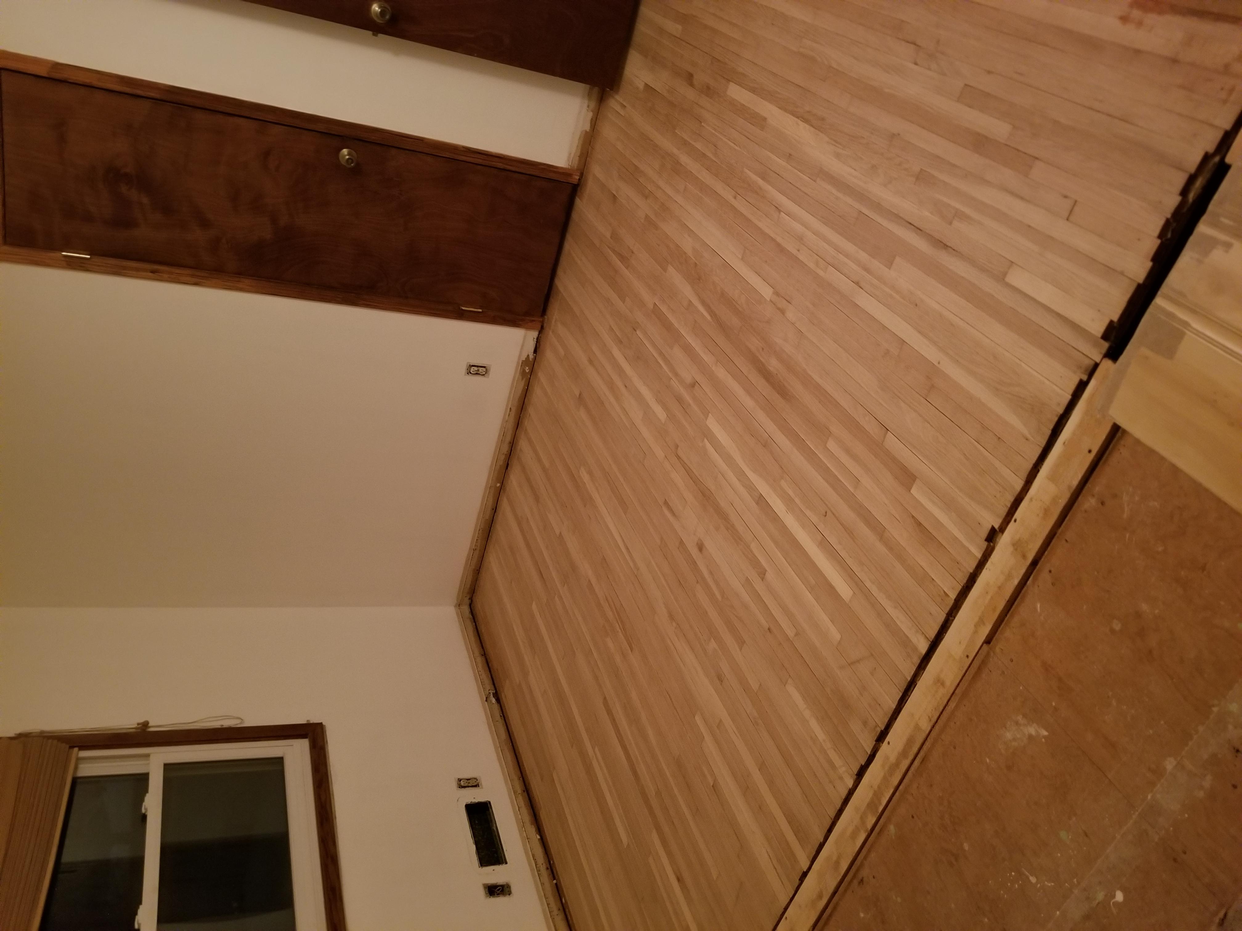 So tonight I started sanding the edges by the wall with a small palm sander thinking it was no big deal. About 30 minutes into barely cutting into the wood and the sandpaper flinging off 5 times. I went to home Depot and rented their edge sander. That made quick work of almost all of the corners. The tighter corners I'll hit with a handheld detail sander.