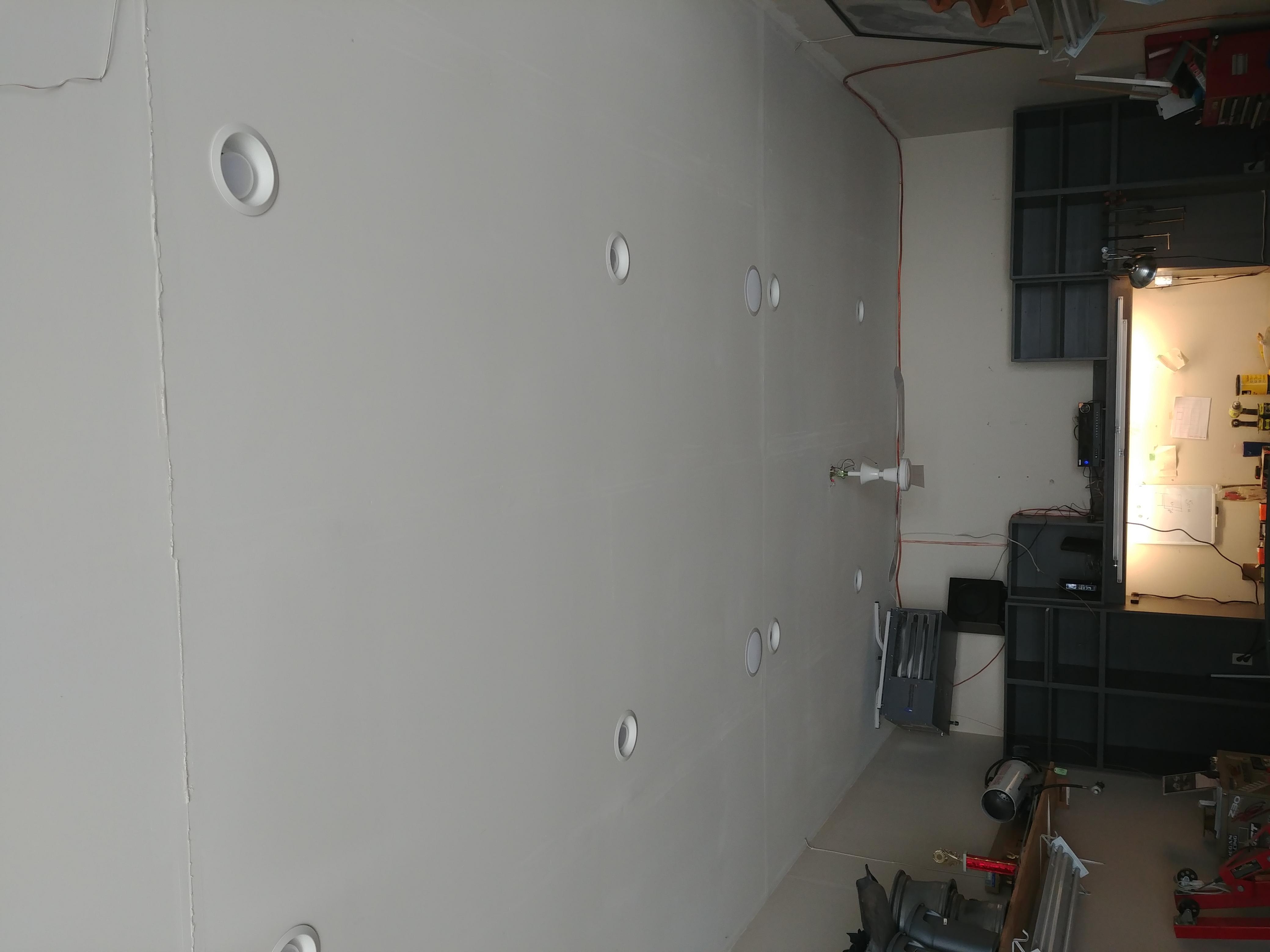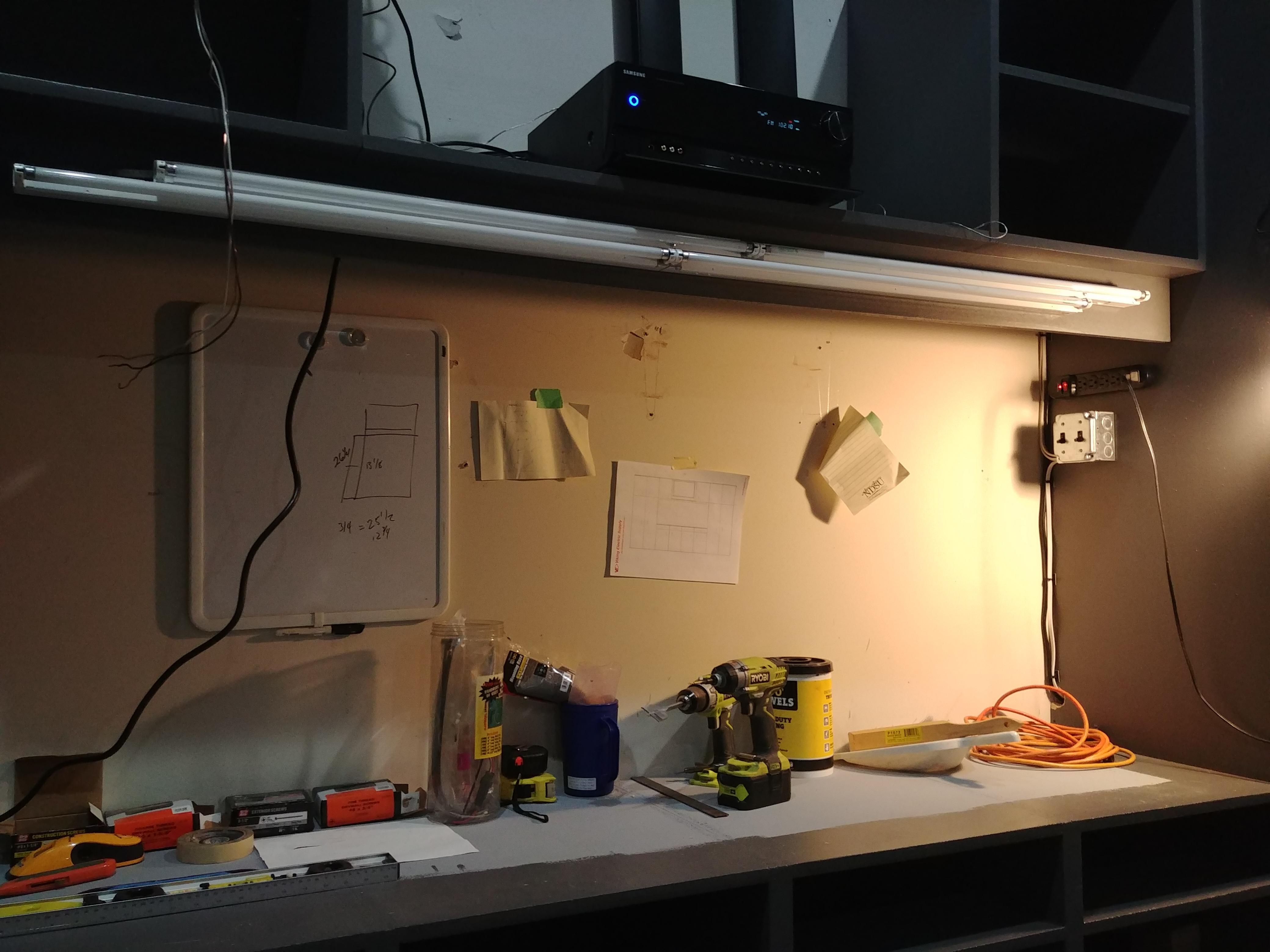 Been working on electrical lately. I have power strips mounted. I have the t5 fixtures mounted. One underneath to light up the work bench surface, and one mounted to shine towards the car for imoroved under hood lighting. Each on their own switch. Still buttoning up that wiring. Also i bought 4 in ceiling soeaker from monoprice ($35/pr). Have our downstairs receiver land sub out therr for testing out. I also bought a used 8" 150w sub off ebay (same as the one im testing out). Hopefully get these ceiling speakers mounted and wired soon. I can fit a max 43" flat screen on the shelf, so im just keeping an eye out for some kinda smokin open box deal at best buy for a 40-43" smart tv (hoping for something around $150).