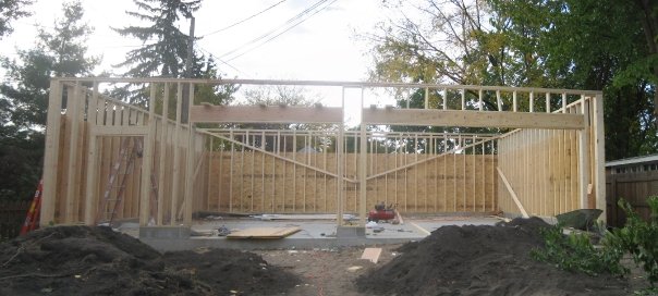 Here is my house project. I am getting close to being done. The basic idea was to destroy the crappy old, small, ugly and quite flimzy 20x20 garage that I had and build a new 30x40 garage. It's made of 2x6 entirely, the sidewall is 11' 1/2", the peak is at 18', the doors are insulated and it will be filled with R19 and sheeted everywhere. The windows are 4x3 double pane/argon filled with enough silicone around them to make any DSM-er proud. Just got done with the running the electrical/cat5/coax and will try to focus on facia and siding this coming week. Hopefully I'll be able to finish it before it gets really cold. I really miss working the RWD tube car. This should be a nice new home for it.