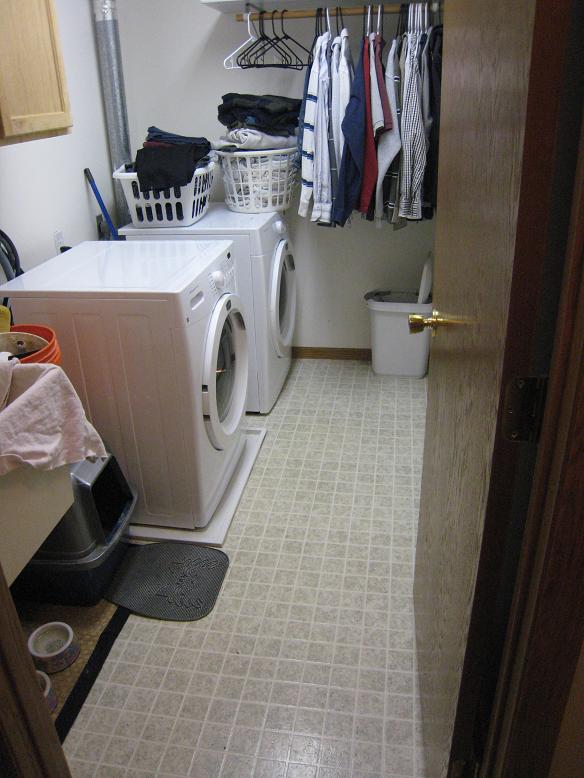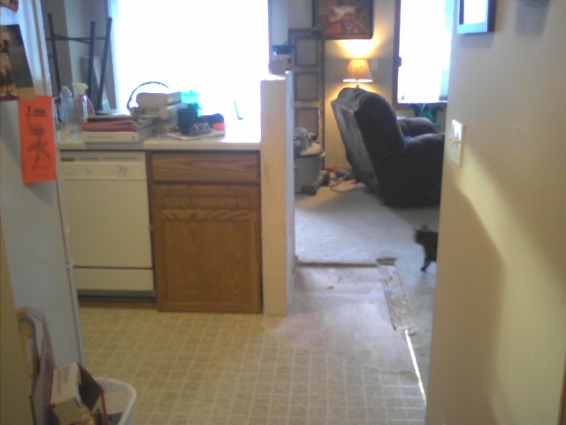 So I decided to get cracking on my main level. Already have the new appliances as I mentioned earlier (fridge, stove, microwave, dishwasher, clothes washer/dryer). So now the first step is to replace the kitchen flooring that is trash. I had a bunch of Home Depot gift cards, so I just went and bought a bunch of Light Oak Pergo flooring that will be going in the kitchen/bath/laundry. Also I am eliminating one cupbard spot. Reason for that is the way it's setup right now makes the dining room huge, and the TV/couch area small. Moving that end over one cupbard spot will help eliminate that. Then once the counter is modified, and the flooring is in, I'm going to get the whole room and the stairway coming up to the main floor re-carpeted.