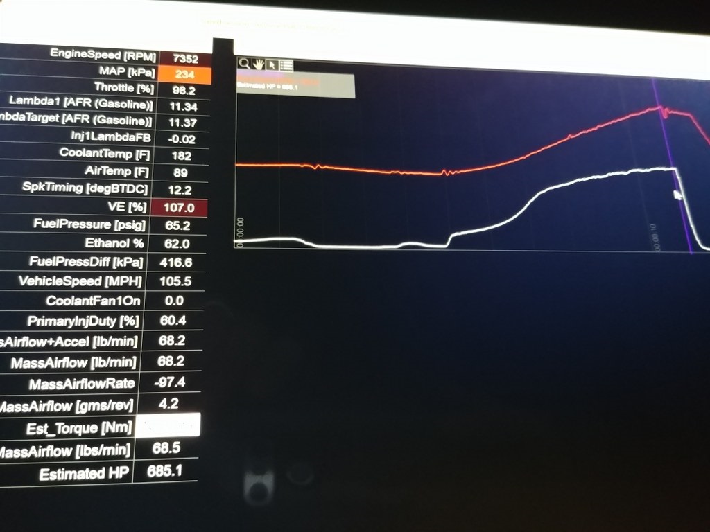 Nothing to huge to report. But we're done with the pump tune. Slowly starting to mix in e85 and turn it up. We're at about 20psi now on ~e60. So far so good. I know this graph isn't going to be all that accurate, but gives a general idea. Not to bad for e60 at 20psi  Plenty of room left to keep going!!