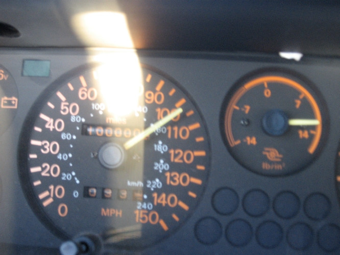 Well, my car just turned 100,000 miles old and I documented the occation with my woman's digital camera, which I still need to steal to get the pictures onto a computer. Anyway, you can imagine what the dash looks like during the 100K salute, so pics will be whenever I can get them.