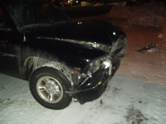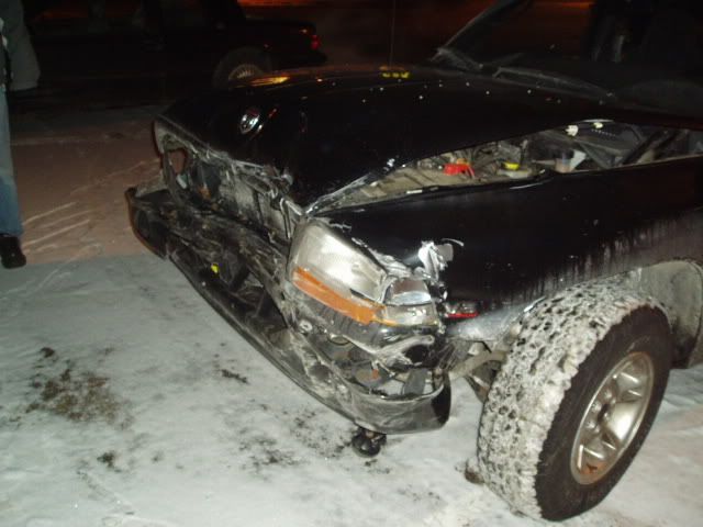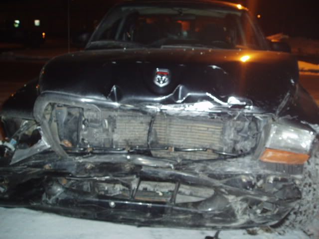 Damage is pretty damn extensive. I'm sure the Dakota is totalled. I'm definitly really freaked out right now because I never saw it coming, and my airbags never deployed. I'm unhurt, but my back is really sore and my mind is going a mile a minute.
