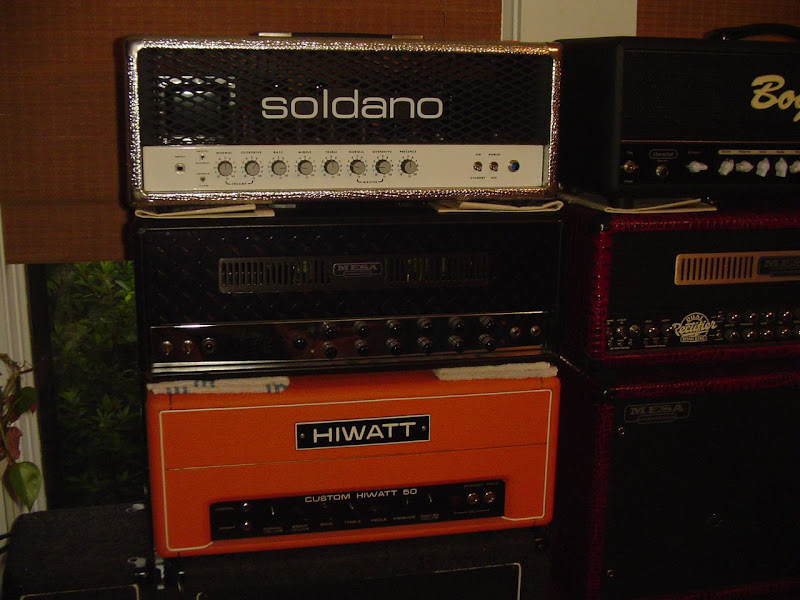 Starting top left and going clockwise; Soldano SLO, Bogner Uberschall, Mesa Road King, Mesa 2x12 open back cab w/c90's, Mesa 2x12 closed back w/Celestion v30's, Randall 2x12 w/Eminence's, Randall RG80ES, Hiwatt DR504, Mesa Dual Recto