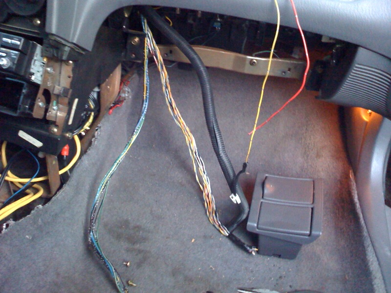 And a bunch of wiring that was no longer needed. Left group was for the airbag computer, right group was for an unknown harness under the passenger seat. The only thing I saved out the entire bundle was the ebrake light cable (hanging yellow)