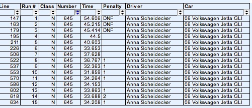 Yeah Rachaels are messed up cuz our friend got there ready to drive his C6 vette and when he pulled into his parking spot after tech noticed that his front tires were cored on the inside .... so we offered up the mini so he could still race. We messed up and didnt switch numbers around... oh well ... i think its split like this ... 1-9 Spiegs 10-17 Rachael 18-27 Spiegs 28-37 Rachael. But i think some of his runs didnt get counted in the mittle there somewhere.