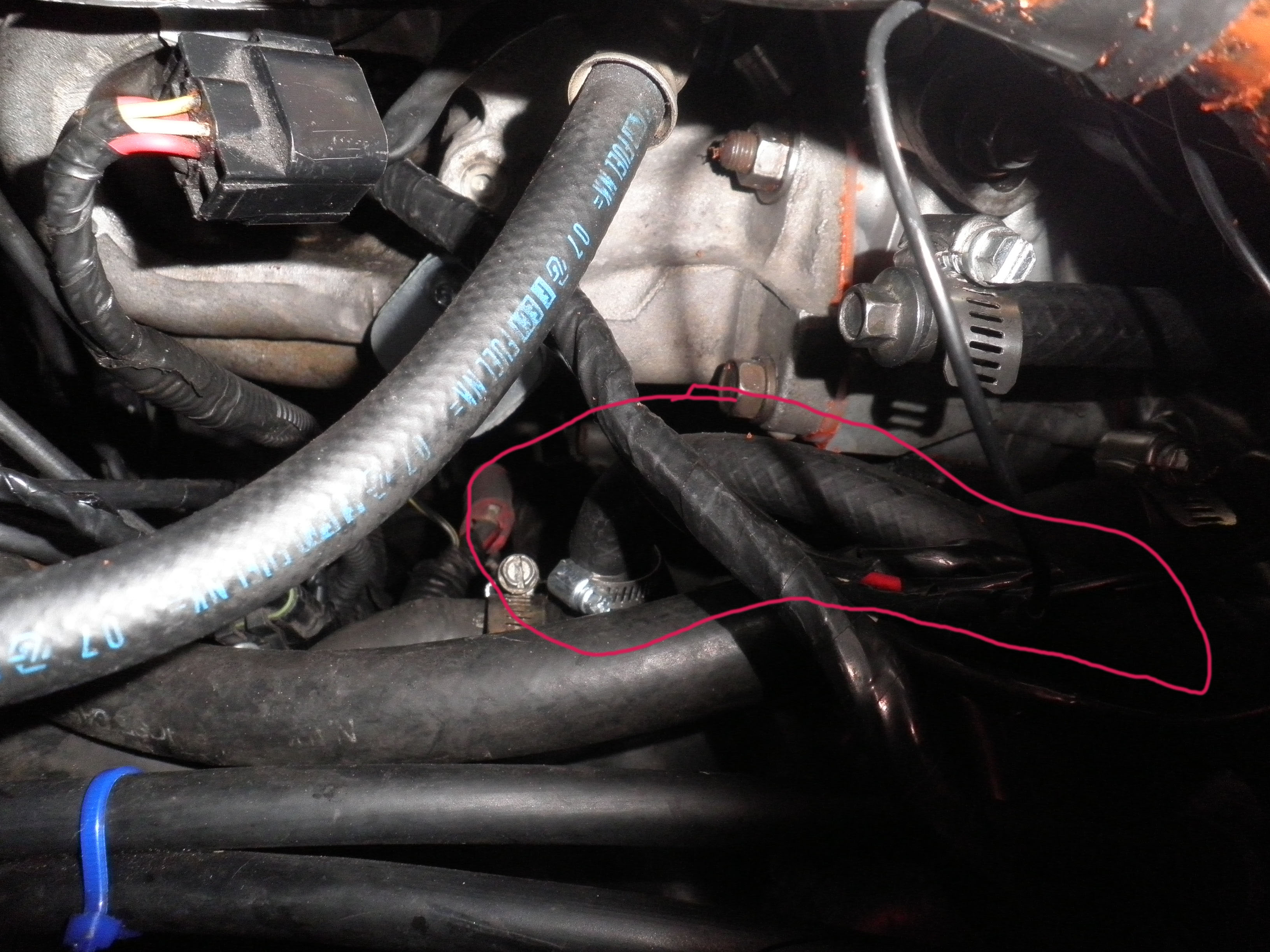 here is the pic, Green Circle is the dump line from the turbo. Pink circle is where the coolant temp sensor is. The feed line is coming from the spout from the smaller main water pipe (by the throttle body)