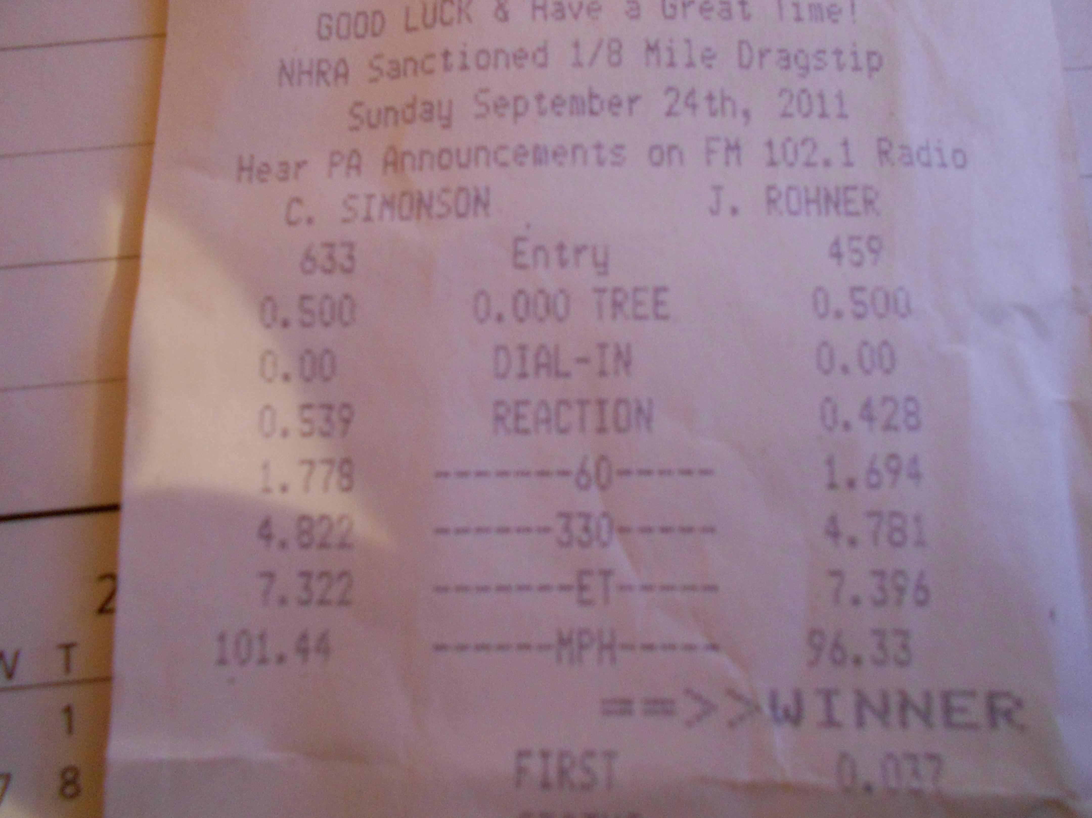 I took the car to Grove creek today. The car ran awsome, shifed great no real problems. first pass off the trailer (25psi hooser 275 DR's) ran a 8.103 @102mph with a 2.199 60ft. almost Identical to my previous best 1/8th. made a few more passes at the same settings cutting a little better 60's and dropping off a few MPH. on my 3rd pass the starting line guy noticed that my DR's has a cut on them from hitting my fender so I swaped on my old 24*9*15 M&H slicks. Next run I cut a 1.960 60ft and run a 7.941@ 90.97mph. time to turn up the boost. I let the car cool for a bit and on the next pass it goes 7.338@98.22mph with a 1.823 60ft. I run a few passes 7.4 and 7.7. The last pass of the day I lighn up with a auto AWD eclipse and run a 7.322 @101.44mph with a 1.778 60ft The tech man at the time slip shack told me next time I come back I better have a fire suite. I left very happy.