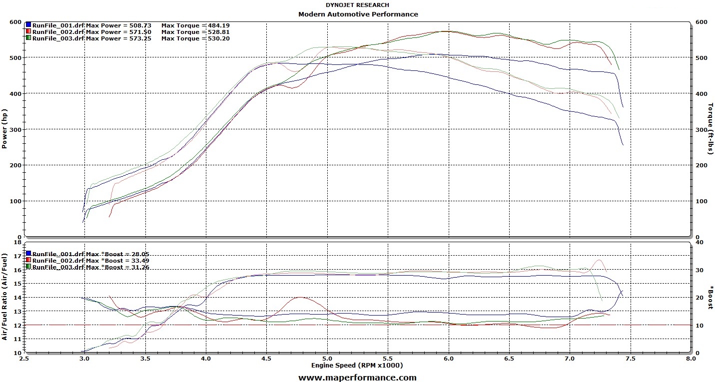 My car seemed pretty much right on the money from making 470-480whp at DB earlier this summer--543whp @ 30psi. The odd thing is that the car ran about 1 full AFR point richer on the dyno than it does on the street (you know....same thing happened at DB now that I think about it)....and I noticed that MAP's map sensor seemed to read about .5psi less than my 4-bar--maybe this was due to smoothing or something? Also the car ran ~28psi on the dyno and I run ~31psi on the street, so I cranked the MBC one full turn to bring boost up. My hybrid setup is pretty nice in situations like this, pretty easy to bump up boost w/o touching the ecu but still maintaining a nice flat boost profile.