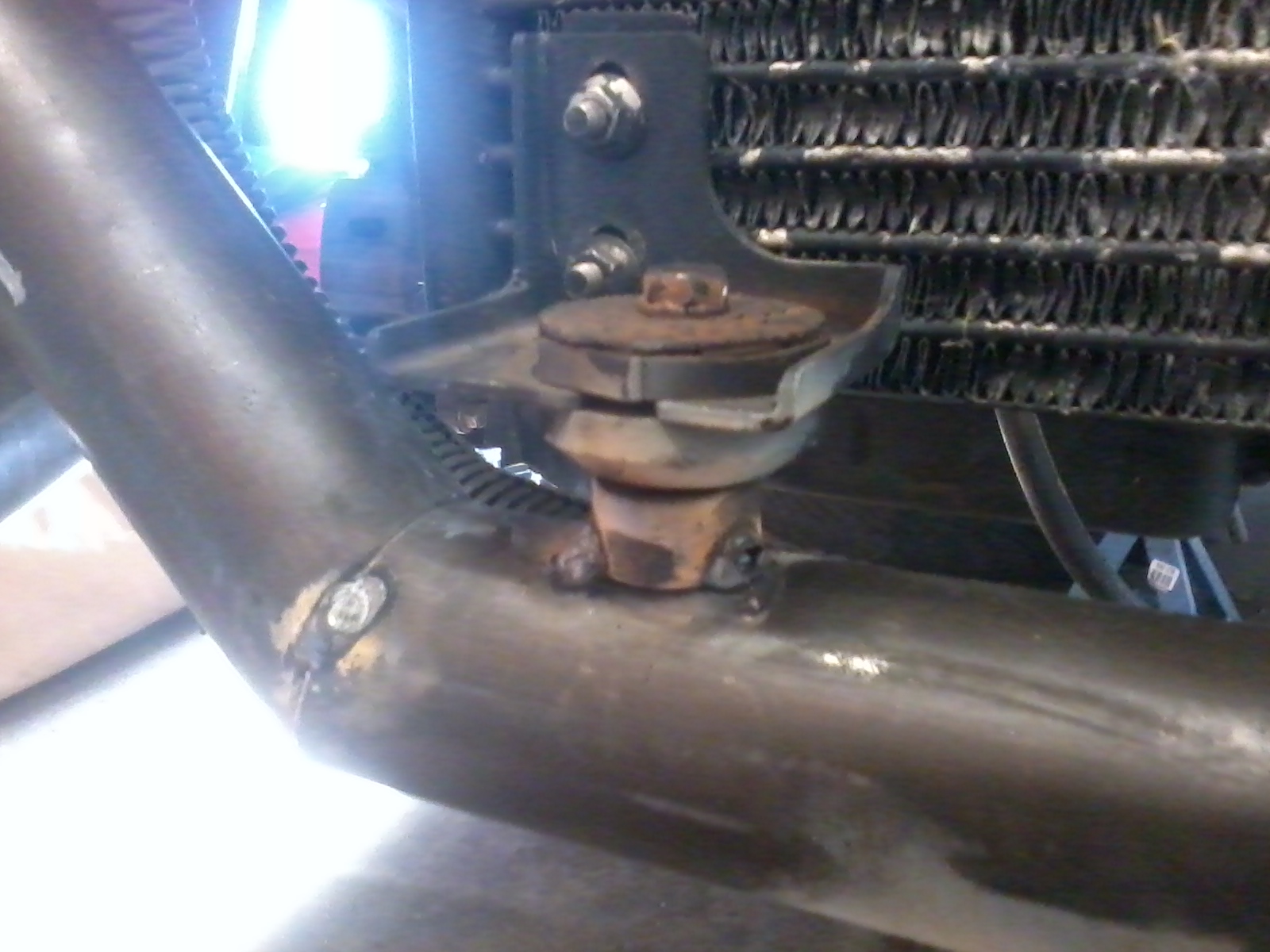 I tacked up the tubular core suport today. I made the lower radiator mounts from some lifting hooks we take off of engines at work and made some mounts for the a/c condensor. I am going to bring it to my Dads to weld it up with his MIG and drill the holes that will mount the North/South crossmember that runs under the motor/trans. Im not sure what I am going to do for FMIC mounts since I plan on upgradeing my Intercooler before spring.