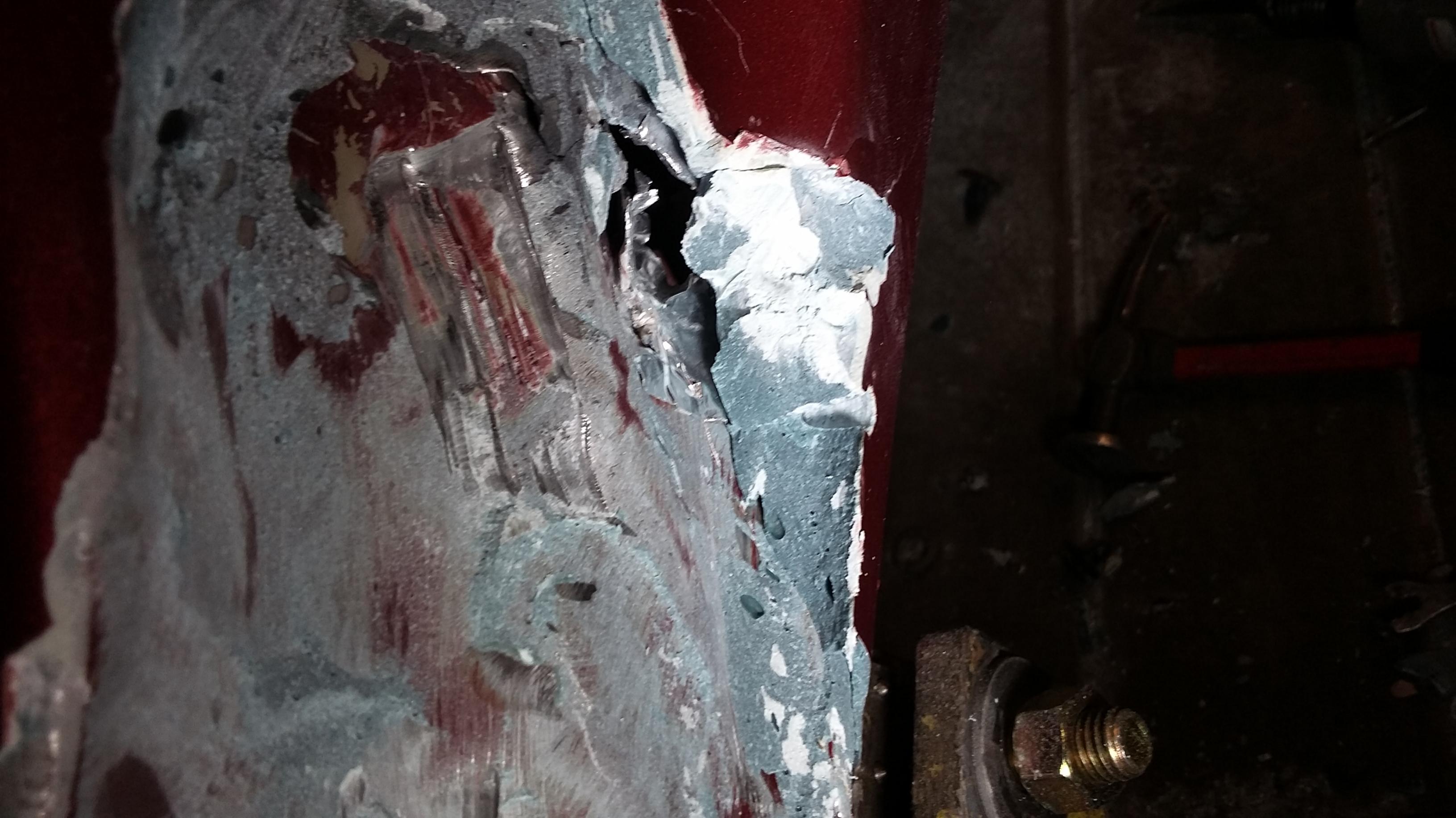 So in these photos shows were the new quarter panel meets the rocker. It's shows how my bond and filler the body shop used to make this think look right. The hole you see in the pics is where the put some hvac tape so the bond wouldn't fall in. I found in some spots the bond / duraglass was over 1 inch and a half thick.