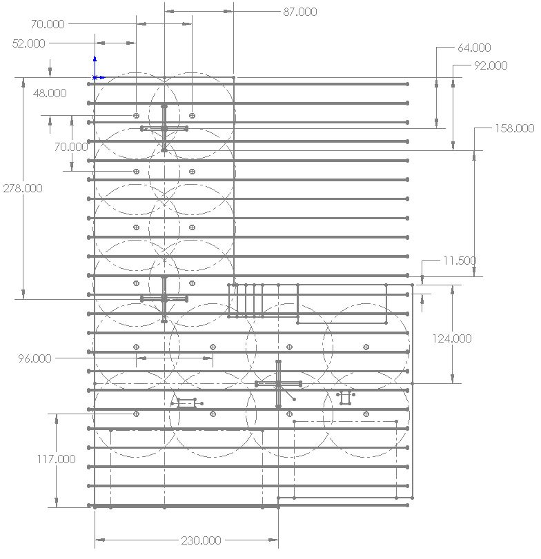 I drew up a pretty accurate / to-scale drawing of the garage using SolidWorks. Some things may be an inch or two off here and there, but overall it's quite accurate. It shows the internal sheetrock dimensions, the 6" can placement, their overall beam width assuming 45* beam width and a roughly 11.5' ceiling height. It shows the 3 fan locations as well as stud locations, garage door openers, and garage doors at full up (wanted to make sure the last row of lights wouldn't be covered up even if garage was open).