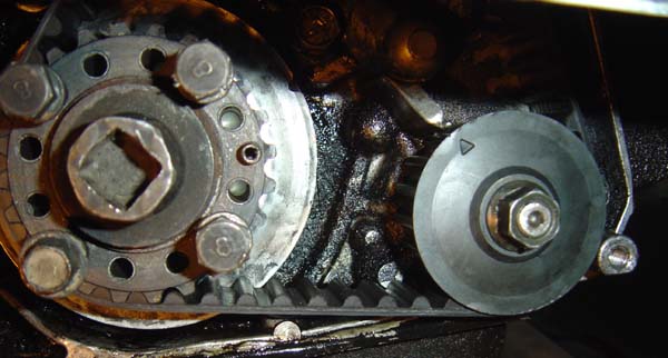 Here is a pic of the crankshaft and oil pump. To the best of my knowledge it is all ligned up on the bottom. Look right to you??? When I align the cam marks the crank and oil pump are each a tooth off (past their marks). Should I have the timing belt put on right or pull the head? Do you think the valves are gone? I guess I could throw in some ARP's and get rid of more crap if I pull the head. What do you think? Will it run if I just swap the belt on their right? Pic of aligned front case with pic above: