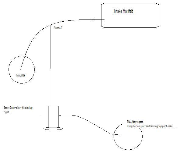 Here is a diagram of how I have it connected now - The MBC shouldnt be controlling the boost because I have it set to the lowest it can go, and the Wastegate's spring is 15PSI- so that is what the cutoff should be.