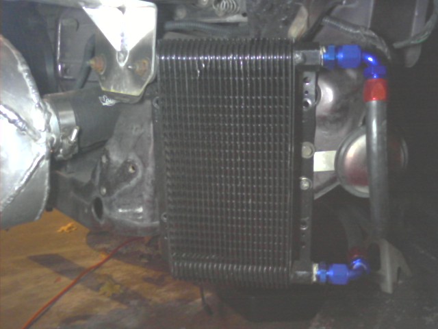 I got my new oil cooler setup on today. I picked up an external oil cooler, and picked up some AN/Push-lock fittings and hose. In the end it cost around $100 for the entire setup. Pretty happy with how it turned out, and the mounted location should work out nicely. She feels pretty sturdy