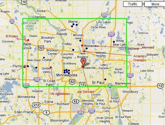 Blue dots marked where abouts some of us live. Me and brownman up in Blaine, Bunch of you in Minneap, Mlomker out in St. Paul, Matt D in Shoreview, the Plymouth folk, etc.