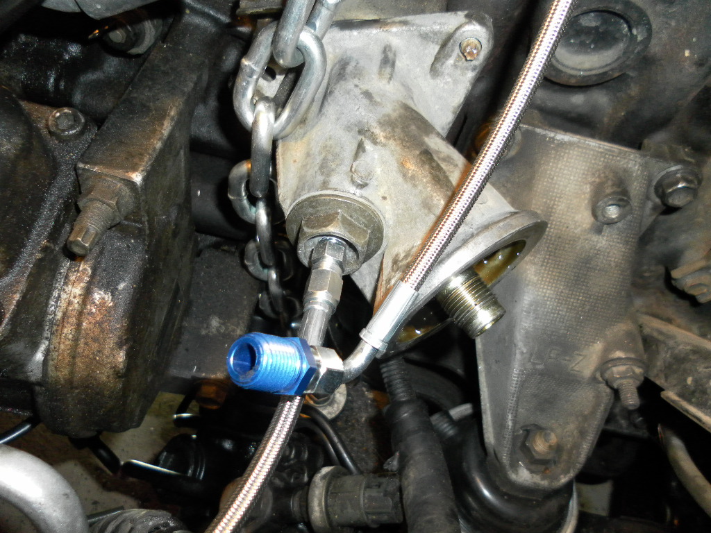 Drilled the oil filter union bolt to accept a 1/8npt fitting for my oil feed. You can either buy one for an IS300 for like $25 and it's already tapped, or just drill the stocker. And well, considering I already had a 1/8npt tap, and access to free drill bits and a drill press, that was an easy choice