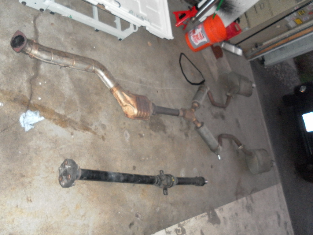 Decided to try and tackle the tranny. First I had to remove the rest of the exhaust. Once I got that off, I removed the driveshaft.