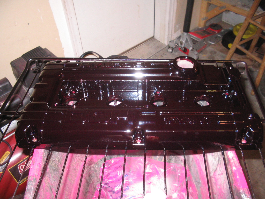 But since it came off, I had a Hyundai cover laying around that I'm going to be throwing on the car. I've been trying to figure out how to make a color to match the Black Cherry color of my car. My idea was to use a transparent/candy red, but with a Gloss Black base coat instead of the typical white/silver/chrome base you'd typically use with a transparent/candy color. Here's the results. It looked like absolute crap before I coated it. I was actually a little worried on how it would turn out because of the poor condition the surface was in and I couldn't get a lot of crap off the surface because it was just caked on it, even after a couple hours of prepping it. But I think it turned out just awesome. If you're just looking at it dead on, it looks pretty much like a gloss black (like you'll notice in the 3rd pic), but once it gets some light on it, then you see the maroon look (like in pics 4+). I think I'll be doing all my piping this color as well. I'm real happy as this was my first attempt at using a transparent powder. Let me know what you all think!