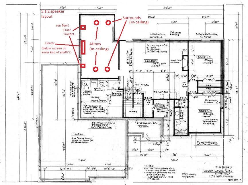 So again, it'll be about a 100" screen (project on painted wall) w/ Benq W1070 projector. Sound will be Dolby Atmos 5.1.2. Sonance in ceiling speakers for surrounds and Atmos (these speakers don't just point down, the point at an angle). Then B&W 693 towers up front with the matching B&W center. Denon 4100 receiver. Then just use our old Samsung Bluray player. For TV we just have uber basic cable, so I have to see if Comcast can give us an HD capable converter box, otherwise I'll have to do like brownman and get an antenna/tuner setup for just OTA stuff.