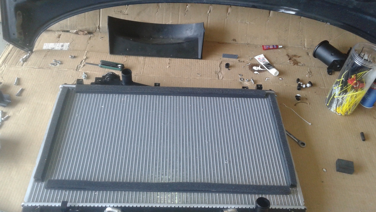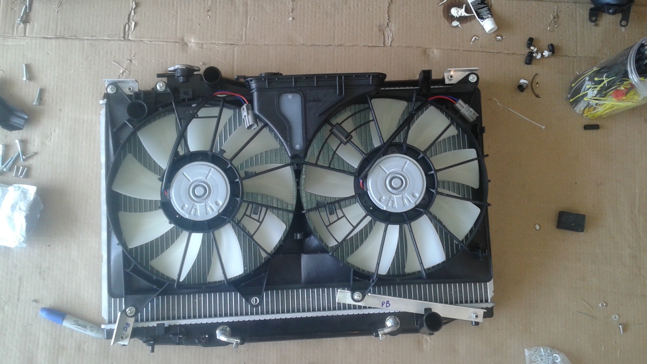 - Installed a new OEM Denso radiator. The old one was just filthy. While I'm at it, I removed the clutch fan setup and will be trying out an OEM IS300 electric fan setup. It's kind of a no-no to go away from the factory clutch fan because electric ones often just do not cool as well. But the IS300 setup is supposed to be the one that actually works decently. So I'm going to give it a go. If it doesn't work for any reason, I'll put the clutch one back in. It's just my fan shroud is broken, and it's just so big and bulky, while I'm in there I might as well give a clean electric fan setup a shot.