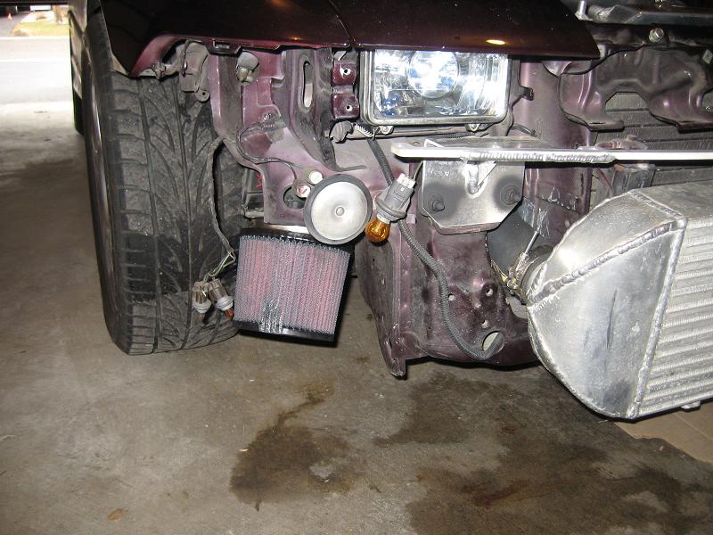 Today I got the SS socket head cap screws put on the valve cover. Got some new studs for mounting the TB. It is mounted now. I had to take the coupler off the TB and put it back on. I'm getting better at it, but what a PITA. Anywho, got the TB mounted with studs and nuts, got the UIC pipe on. Took the turbo off because I want to take the coupler to work tomorrow and cut it down a little bit. Also need to modify the lower IC pipe. So will be taking that to work tommorrow to cut. Also got a new coupler from Napa to replace the ghetto one that was going from the FMIC to the UICP. I took the air filter off to give it it's yearly cleaning. It gets pretty dirty in that fender well. Also took off the old small mitsu filter and replaced it with the ultra small RX8 filter. Getting close! All I have for a camera right now is my cell phone, so sorry for the shitty pics.