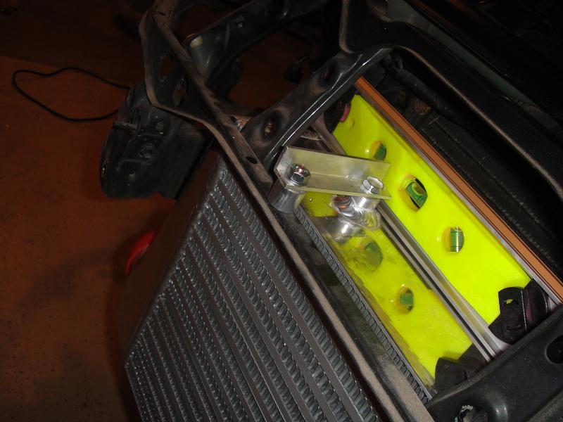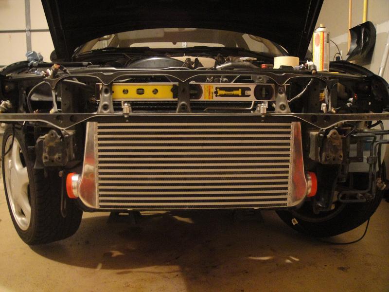 Initial mock-up of the FMIC is done. Couple notes are that there is a TON of room in here to fit this thing. 4" thick intercooler, and zero trimming of the bumper will be needed. Also I ensured to put it high enough so that the bottom of the FMIC will not be hanging below the bottom of the front bumper, which I made sure of because I've seen quite a few other ones setup like that and it looks weird IMO. I got it perfectly level at the moment (made sure the car was level first). Also I took a picture to show the gap between the FMIC and the A/C Condenser. Lots of room in between there. I would have pushed the core back further but the A/C lines would then be blocking one of the inlets of the FMIC, so that is why it is placed exactly where it is. If I could have tucked it back further, I may have been able to retain the factory coolant reservoir but nope, so I'll just be using the old reservoir from my Talon. There's 2 horns. I remounted one a little more out of the way, and the other I will either remount, or just remove as I don't feel like I really need 2. It alsoit looks like I will be able to retain the stock crash beam, but for weight reasons I may just leave the sucker off, we'll see And lastly, doing this made me notice part of my bumper is broken (you can see in the very center the plastic grill piece is broken in the center) ghey, but whatever because eventually (probably not unilt next year) I plan on switching out the the 97+ bumpers so not a huge deal.