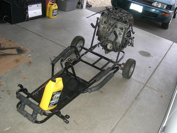 Well, the engine's mounted on the kart frame with just bare bones mounts. The chassis will still need to be extended even more for the rear axle, and the mounts need the living shit braced out of them still, but it's in there and perfect for getting all the electronics and and everything else mocked and mounted up. I'm lazy, and tired, so i'll snap some pics tomorrow