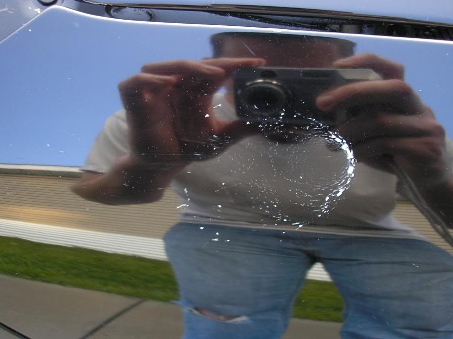 So I'm on my way to work last night traveling east on 62. I see some people up on a pedestrian bridge and don't really think anything of it. As I pass under the bridge I see this white thing about 10 feet off the ground, next thing I know I hear a pretty loud whack and see some stuff splattered on the windshield and side window. Got to work and couldn't really figure out what it was since there wasn't much light, so I looked at it again this morning and saw the remains of an egg shell, the yolk and some egg white streaked down the side of my car. The biggest piece of shell was maybe 5mm square. Since egg can be pretty bad for paint I decided to wash it off as soon as I got home this morning. When I got done washing it, this is what I found....