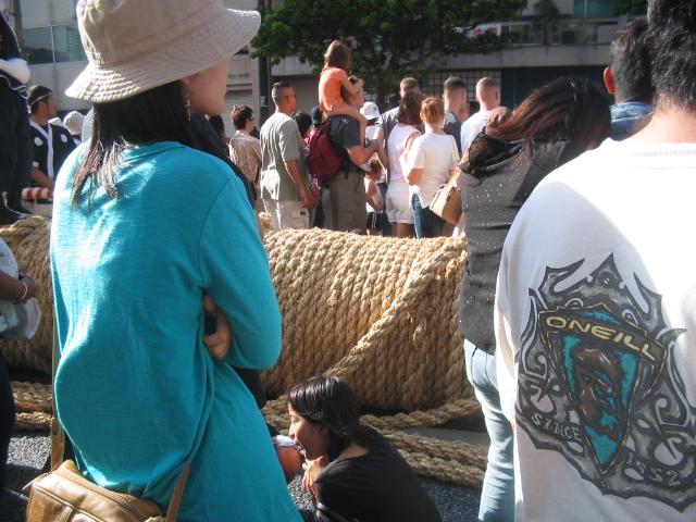 Went to a tug of war this weekend. It's an annual event here in Japan. This rope is in the guiness book of world records. The thing weighs about 7 tons. Tens of thousands of people show up for this event. It was pretty neat. Afterwards there is a huge beer fest that's about a 10 minute walk from the tug of war. The rope is so big that it can't be lifted, and people are walking up on top of it. There are smaller ropes that branch off the sides of the main rope, like handels, and that is what you tug. Everyone just grabs the side ropes and starts pullin. Here's a few pics!